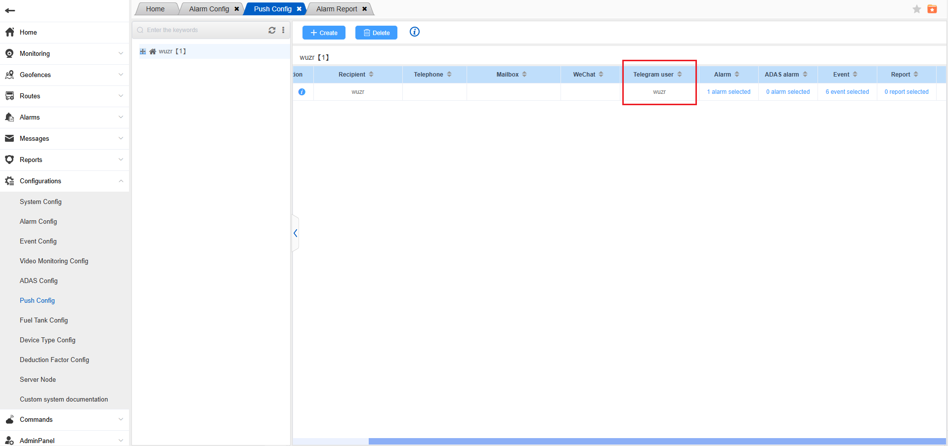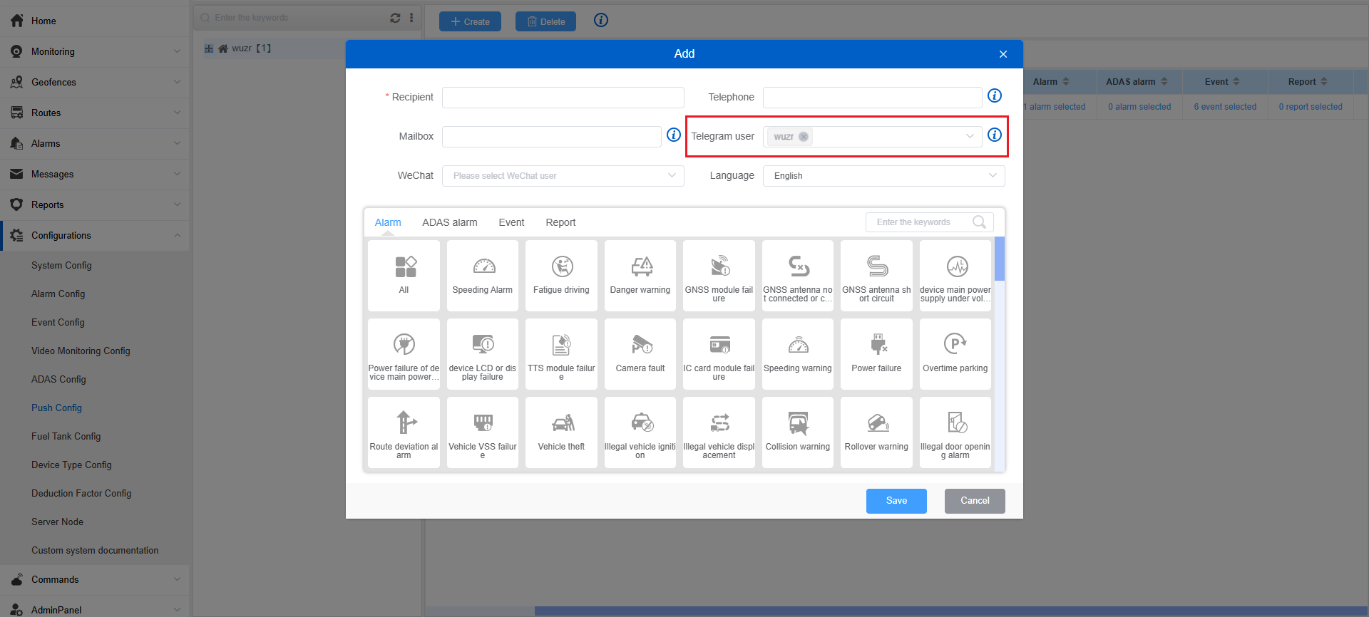 2、配置中心-推送服务配置。可以选择已关联电报账户的系统账号