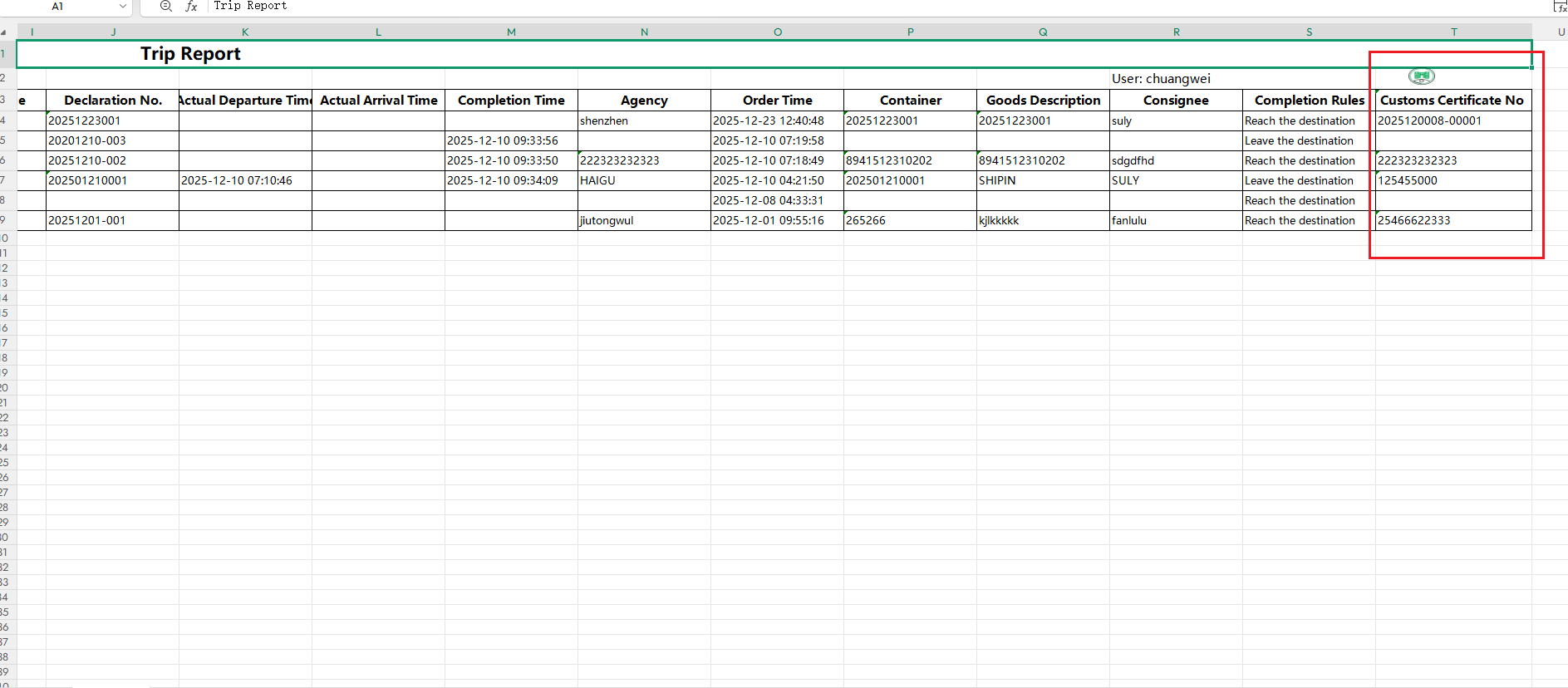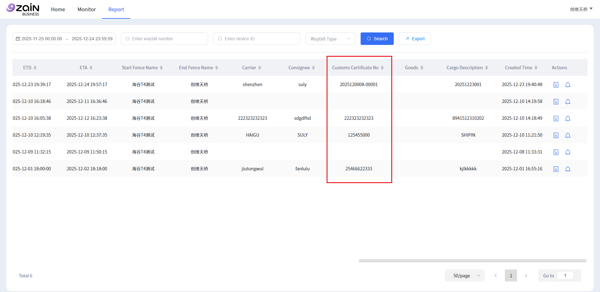 运单报告中增加海关证书号