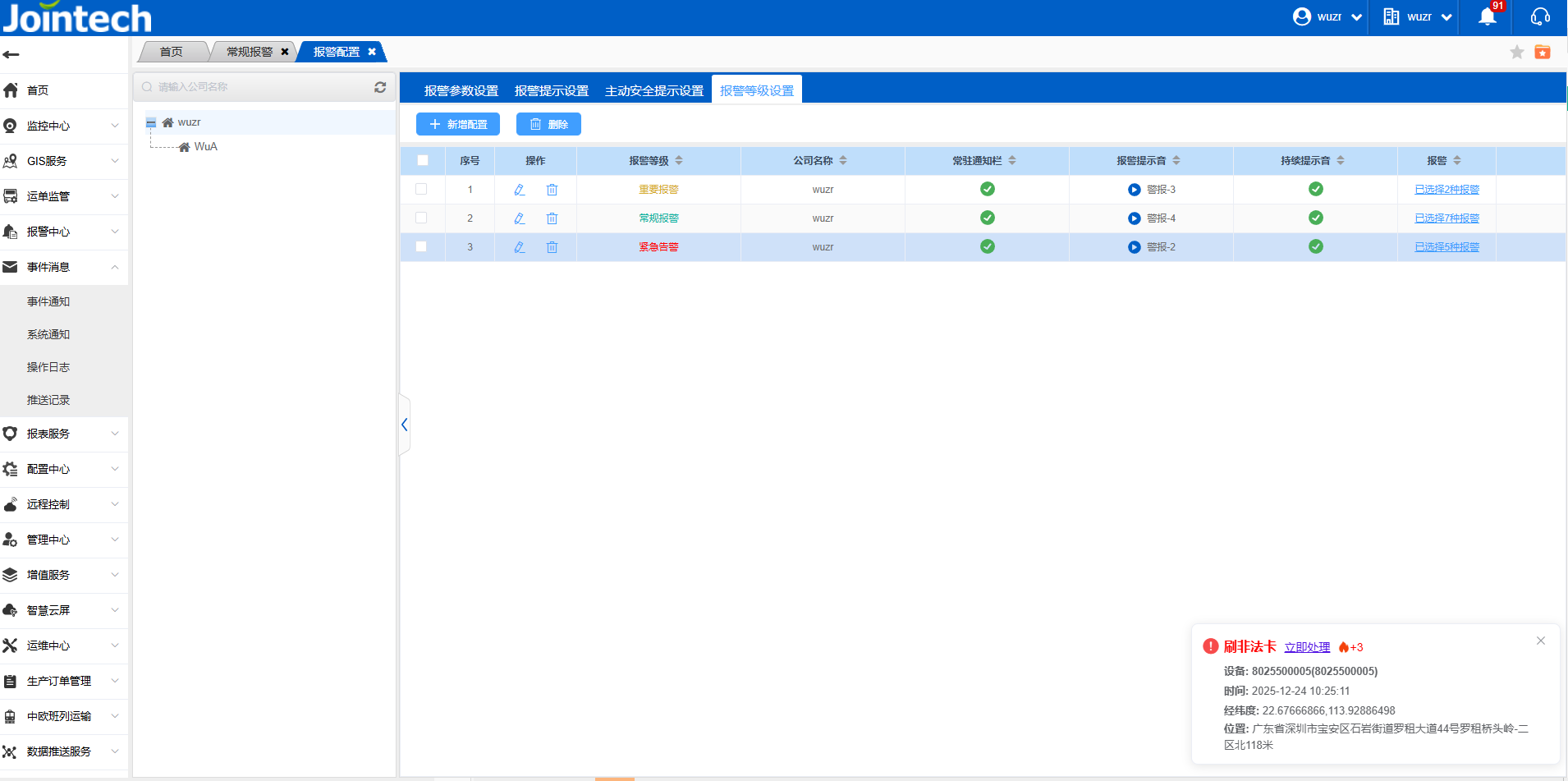 1、配置中心-报警配置。新增报警等级设置