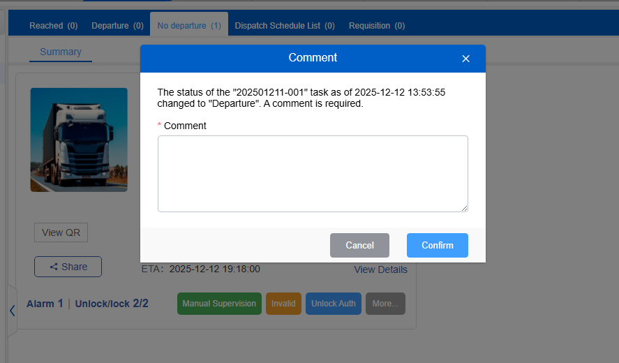 When the status of a waybill changes, a pop-up window is required for the operator to sign and confirm.