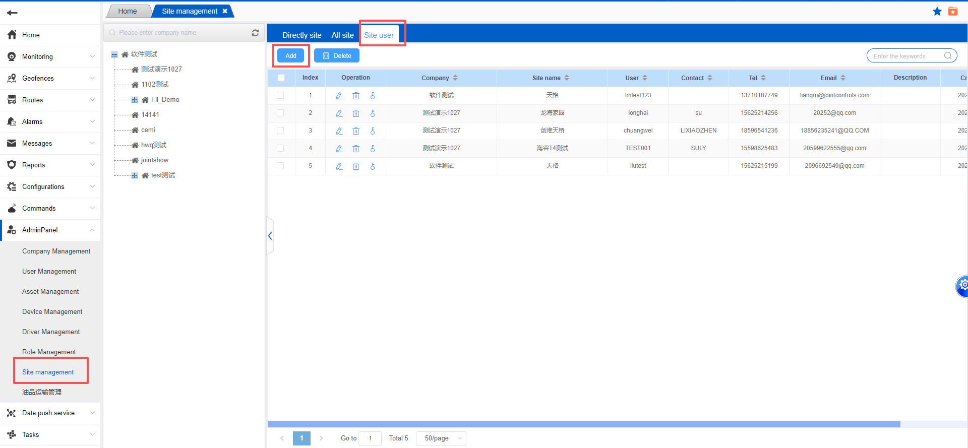 Site management is primarily used to manage and maintain site information in customs supervision operations: it supports adding, modifying, viewing, and deleting sites. The list displays key information such as company name, site name, contact information and telephone number, site style, associated charging cabinets, radius information, and address.