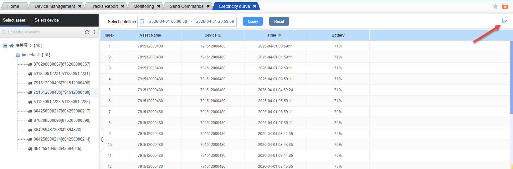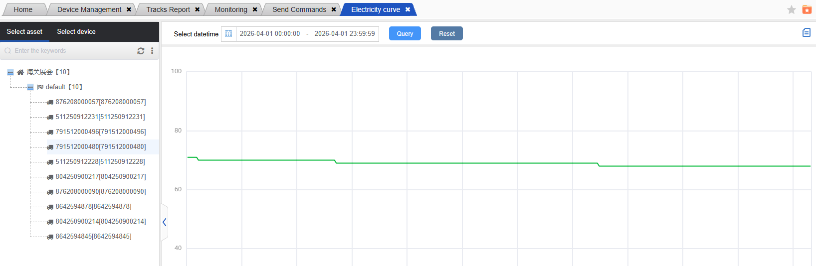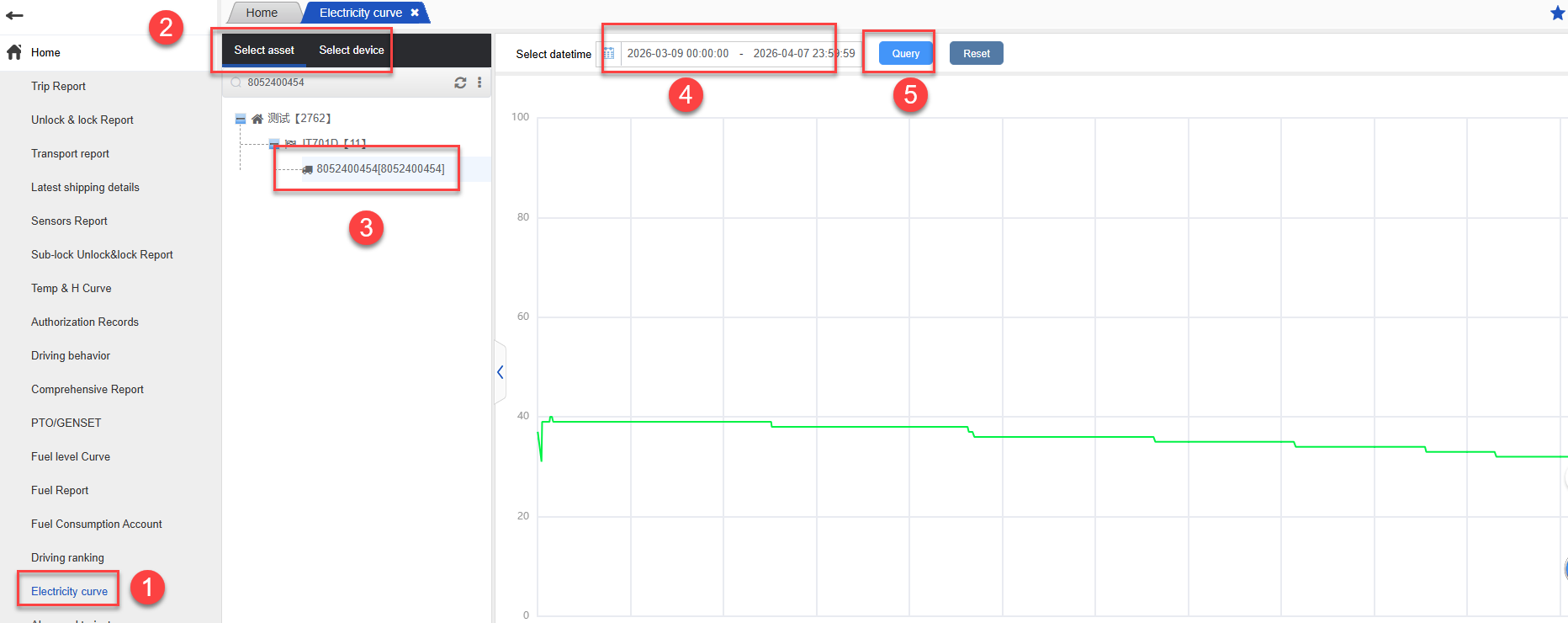 Operation steps: Reports -> Electricity Curve -> Select asset or device -> Select date range and click “Query” to proceed.