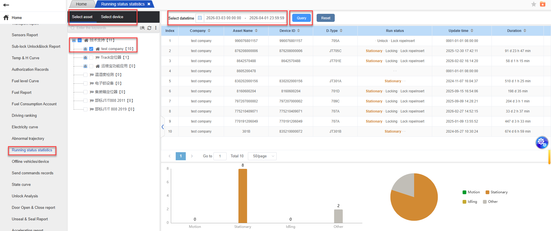 1.Operation steps: Enter the running status statistics report; Select the asset or device -> Choose the date and click on “Query” -> The terminal data of the company that matches will be displayed; The upper part shows the running status data through data display, while the lower part presents the running status data in the form of bar charts and pie charts.